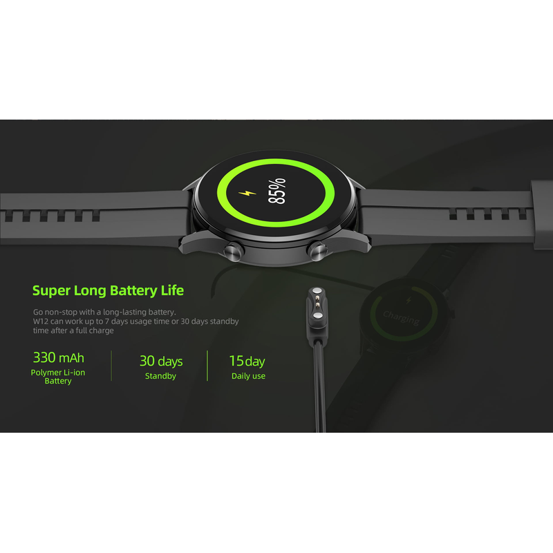 Autonomie exceptionnelle Un système de gestion de batterie optimisé pour une autonomie pouvant atteindre 14 jours pour la montre intelligente W12. Débarrassez-vous de l'anxiété provoquée par le chargement et gardez l'énergie dans la rivière. La batterie de 330 mAh de l'Activit tstrackers est prête à vous alimenter pendant plus d'une semaine.