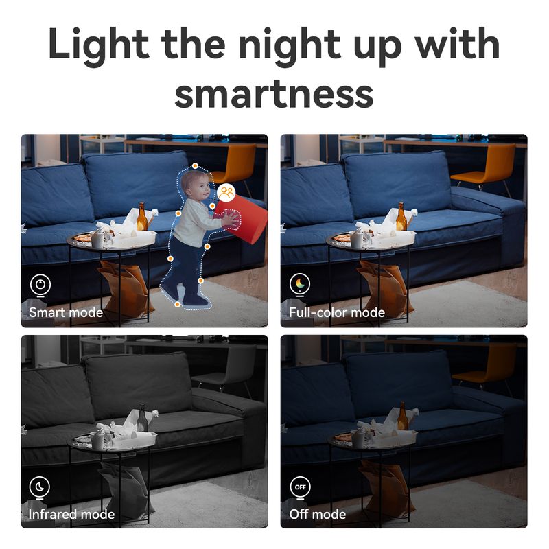 With multi-mode options (Smart/Full-color/Infrared/Off), it caters to various nighttime needs, combining intelligence, clarity, and user flexibility for optimal night-time surveillance.