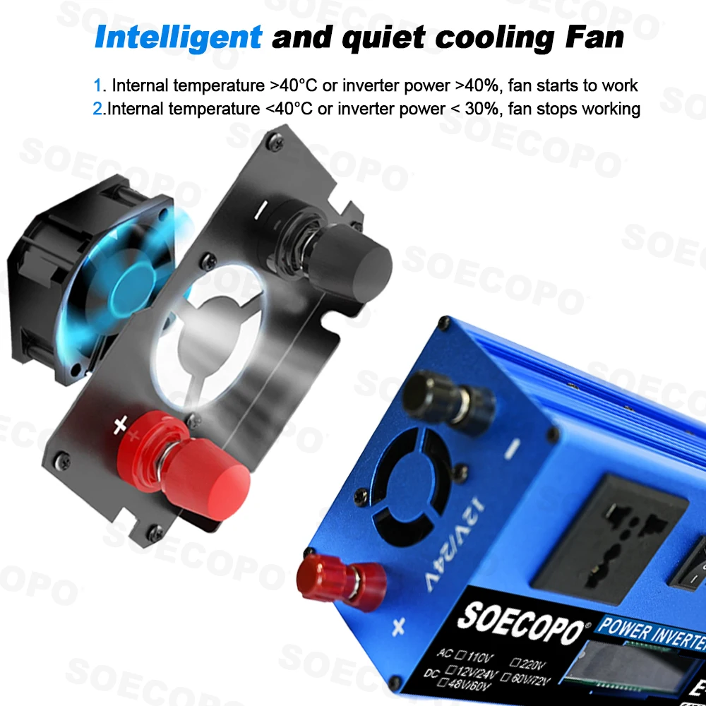 Compatible with 12V/24V/48V/60V/72V DC sources (car batteries, solar panels, etc.) and outputs 220V/110V AC for global appliances.