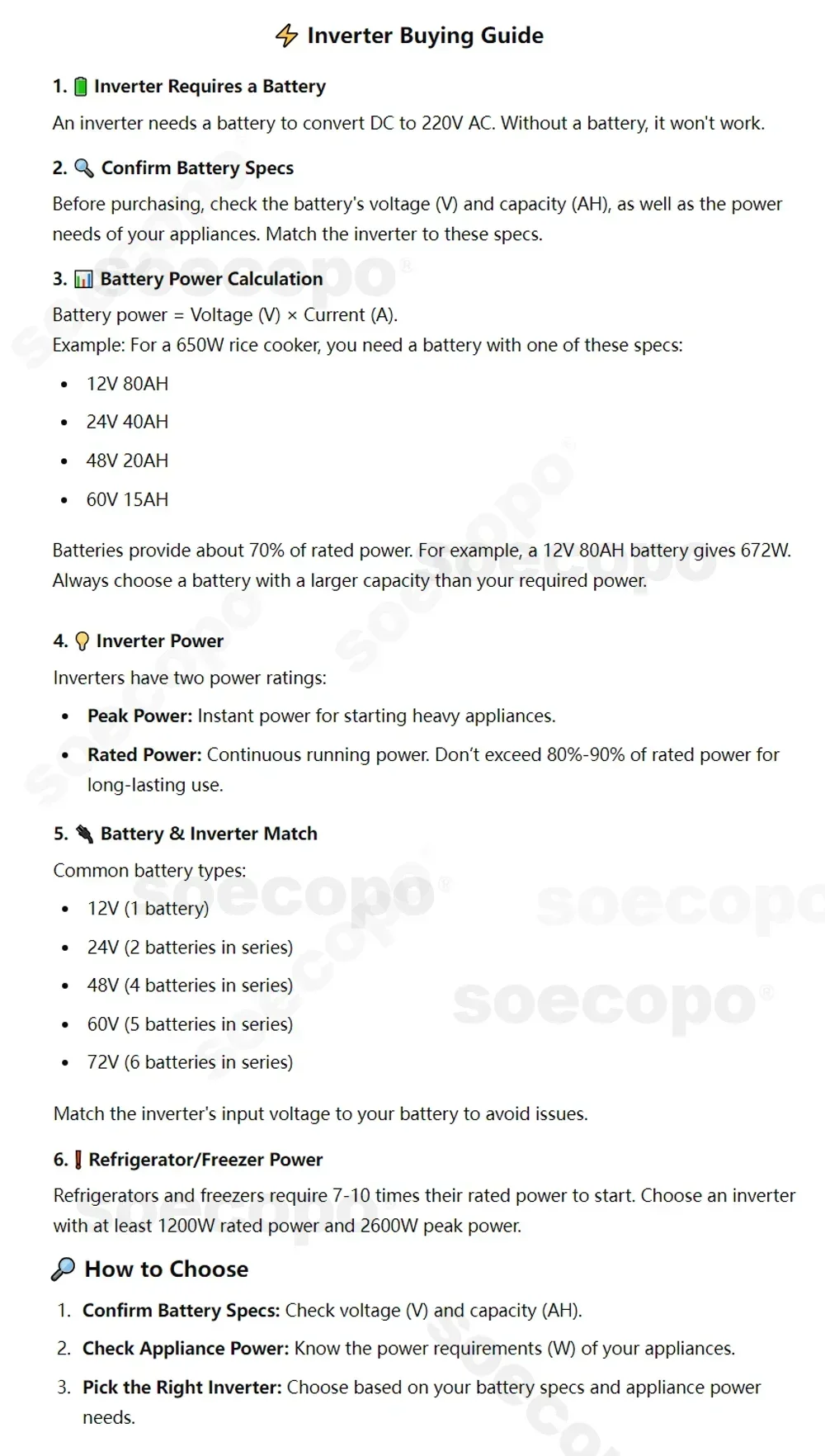 📉 Load Limits: Never exceed 1000W total load. Avoid high-power devices like air conditioners (allow 10% buffer for safety).