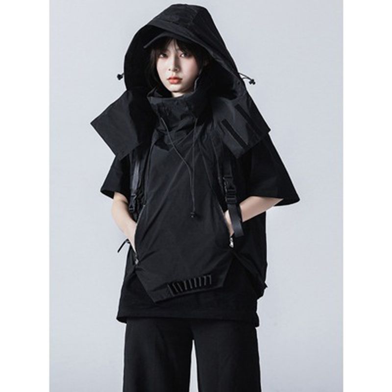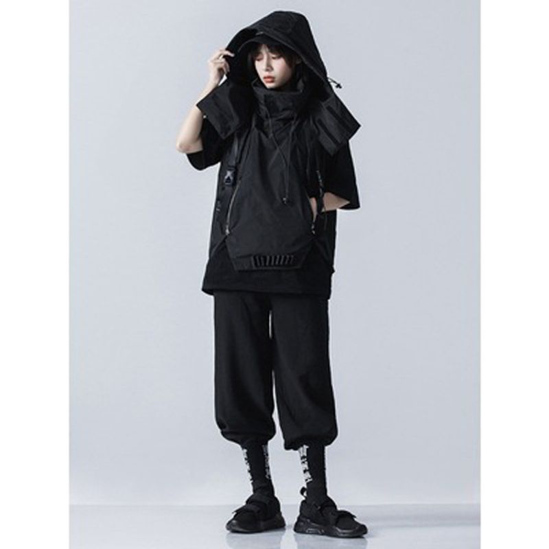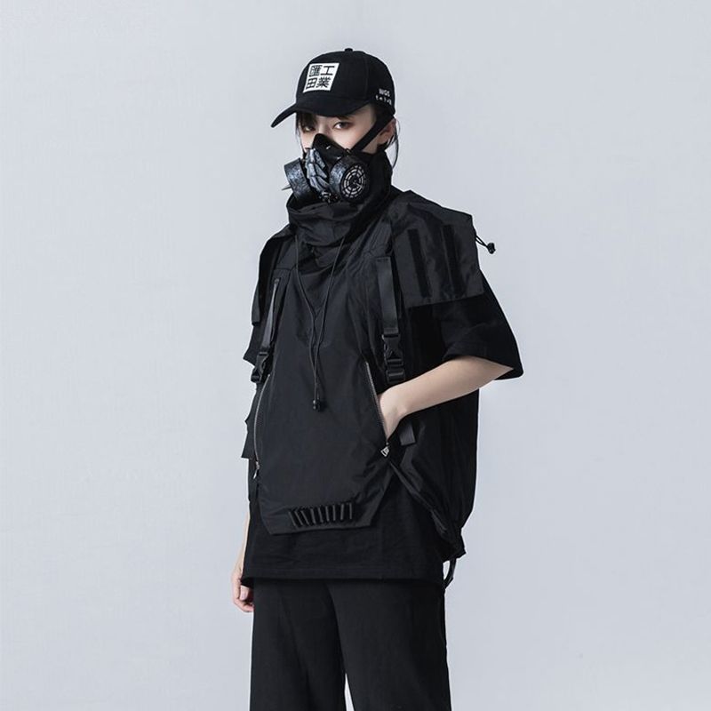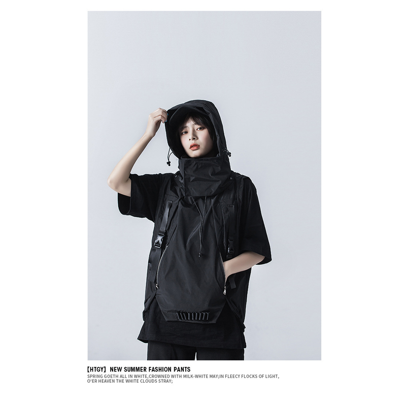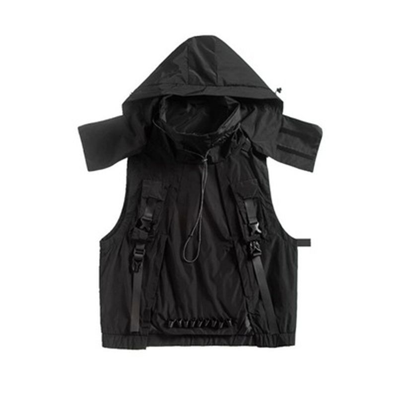 Industrial Dark Mechanical Style Hip Hop Hooded Tactical Vest Coat Men's And Women's Detachable Hat Black XXL