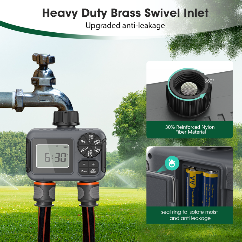 【Easy Installation】 The Automatic Watering Timer is a breeze to install. Its waterproof and clear LED display shows all the important details like watering time and battery capacity. The 360° rotatable interface makes it easy to install. It comes with two 1/2" quick hose fittings. Can connect the threads of the 2 zones Hose Timer to any standard 3/4" or 1/2" garden outdoor hose. The Garden Hose Timer is IPX5 waterproof, it can handle everyday use. Just note it only supports 2*AA 1.5 alkaline batteries (not included). It's designed for convenience and functionality in your outdoor watering setup.