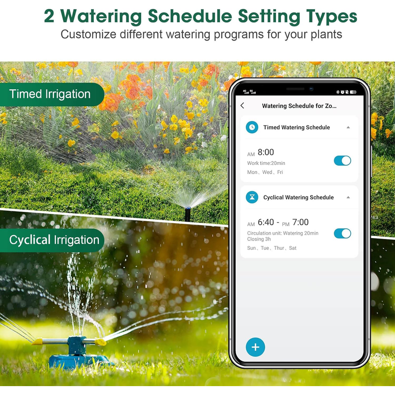 【2 Watering Schedule Setting Modes】: Under timed watering mode, you can set a timed watering schedule to let the hose timer run on its own and water at a specific time. Under the cyclical watering mode, the hose faucet water timer will cycle watering within the preset start and end times automatically. When the irrigation duration, interval time, start and end times are set, the smart irrigation timer is ready to take over the control of the lawn and garden.