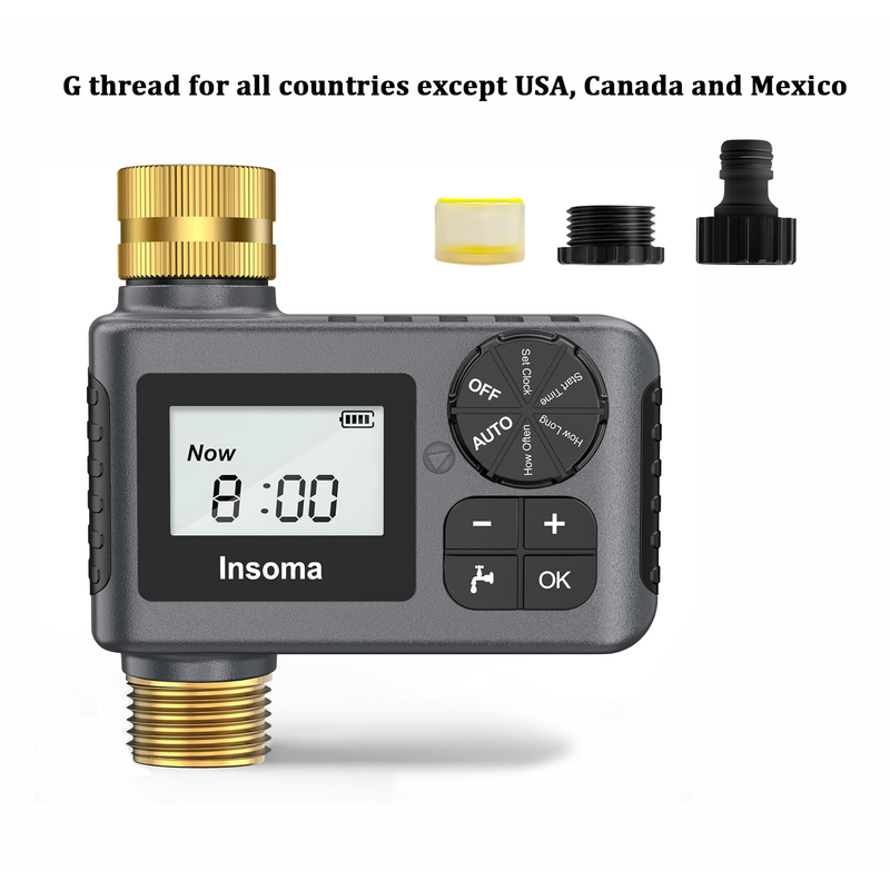 Long-lasting & Durable: Insoma water hose timer is made of IP55 waterproof material and added a seal ring in the battery cover to isolate moisture. The material of hose timer's connector is added 35% fiber, which can withstand high water pressure from 7.25 psi to 116 psi. Each sprinkler timer is equipped with an additional reducing hex bushing (3/4" Male NPT to 1/2" Female NPT) , a 3/4 inch GHT male thread and thread seal tape to fit different size hoses or faucets to prevent it from leakage.