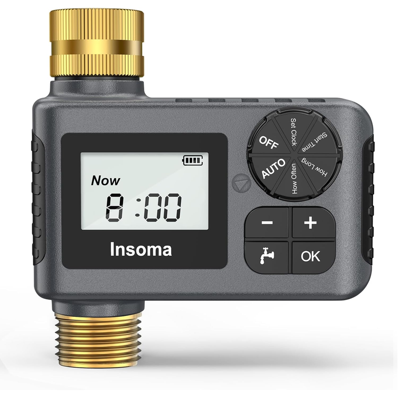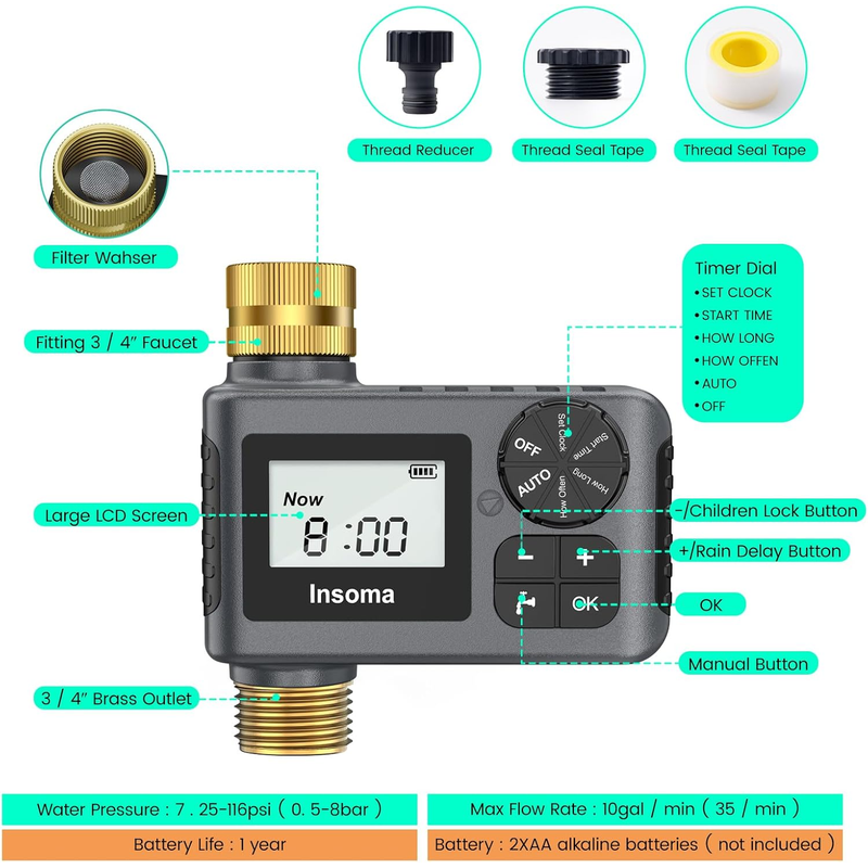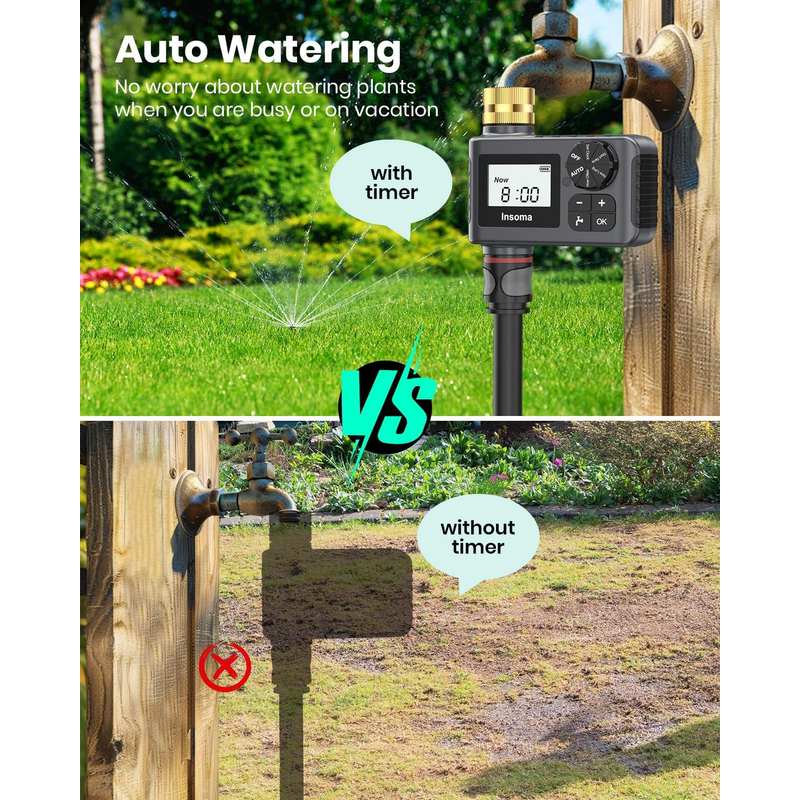 The INSOMA brand focuses on creating high-quality garden irrigation products. the garden irrigation system timer is deal for outdoor gravity drip irrigation system, garden irrigation watering, lawn sprinkler controller, greenhouse mist system, pool, etc.