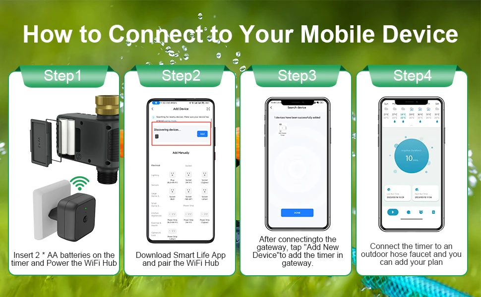 • Easy APP Remote Control Use the Smart Life APP to add the WiFi Water Timer to your WiFi hub (2.4 GHz WiFi only) so you can create watering schedules anytime, anywhere. The WiFi Sprinkle Timer connects to the gateway via RFID technology and supports longer distances (up to 196 ft.), providing a more stable signal than a Bluetooth connection. So you can travel with confidence! Note: Not compatible with tablets.