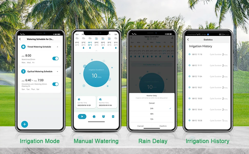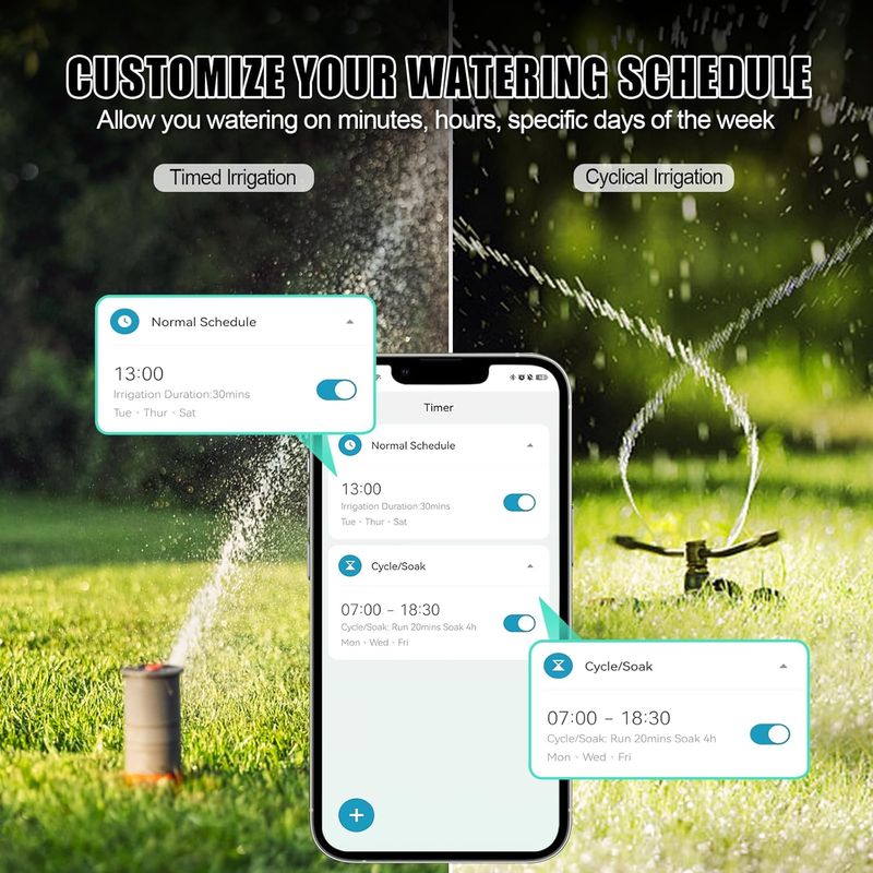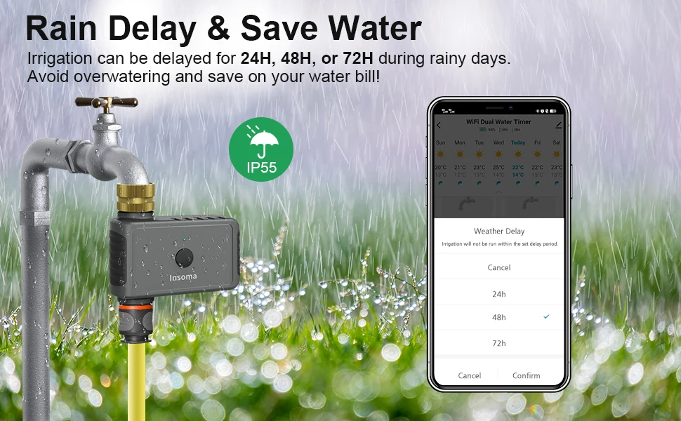 • In rainy day, the rain delay setting helps you pause your schedule 1-7 days and will be automatically resumed, saving water and bills.