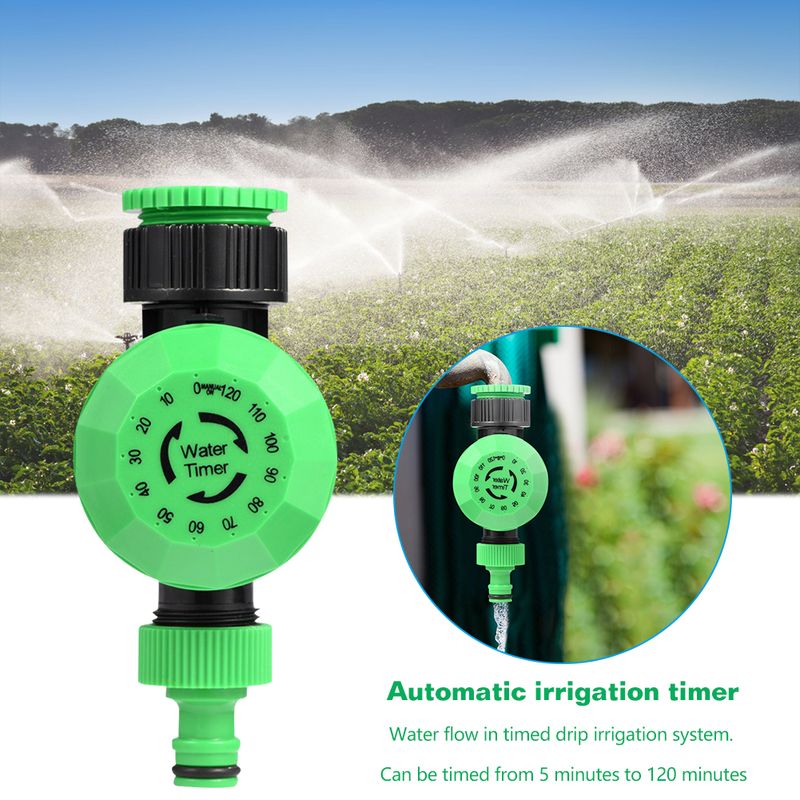 Feature: Garden water timer, for the irrigation of your flower, plants, lawn,agriculture, villas, industrial irrigation! Easy installation, water-saving performance! Water is generally used low-pressure. Common household water pressure to meet its work! and long lifespan, widely accepted by users. Specification: Material: Plastic Color: Green + Black Size(approximately): 14x6x8.3cm/5.51x2.36x3.27in Timer: 5-120 minutes No battery needed Water Timer 5-120 minutes Step 1: Screw the water timer on to the water tap Step 2: Now fix the garden hose to the other end of the water timer. Step 3: Press the lock button once so as to secure the hose connection How to Program: Simply select your run time. The dials can be turned clockwise. How to Set: Turn the dial to "MANUAL ON" and water will flow from the selected outlet. To set your run time,turn the dial to the required watering time. Select 5,10,15,20,25,30,35,40 to 120 minutes for normal garden watering. When time expires,the water shuts off automatically. Note: Due to the different monitor and light effect, the actual color of the item might be slightly different from the color showed on the pictures. Thank you! Please allow 1-3cm measuring deviation due to manual measurement.