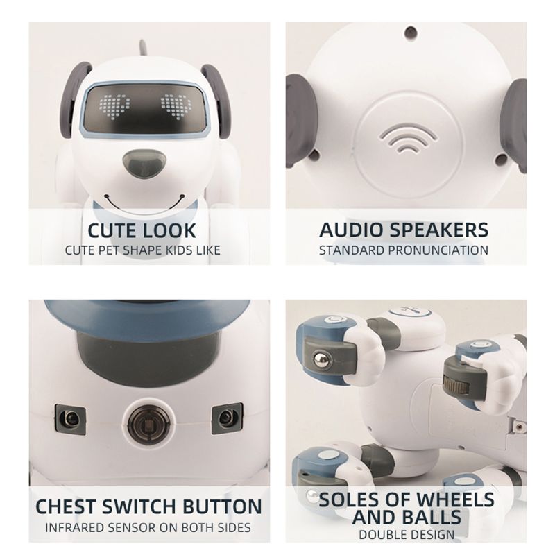 Say hello, sit down, and please perform stunts,Handstand rotation and flip action,Push-up exercises,Cute stunts,Smart touch sensor interactive funny dog mode,Intelligent marching follow,Simulate a smooth and changeable stunt music and dance combination.