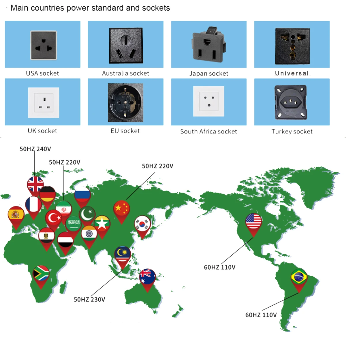 Socket: universal type /Australia socket/ USA, Japan, Canada, / Brazil socket/EU plug