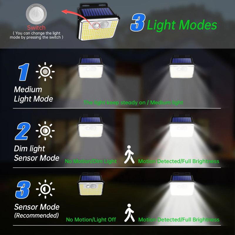 【148 leds Solar Light】--our led solar outdoor lights come with 178 high quality LED beads with a 180°lighting angle. The upgraded motion sensor outdoor lights can automatically charge during the day and light up at night.