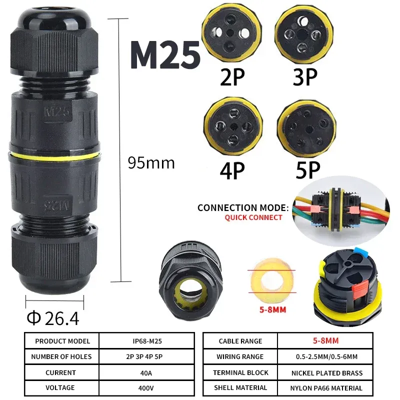 IP68 Outdoor Waterproof Junction Box Electrical Cable Connector, Easy to Install,M16 M20 M25 for Ø3.5-14mm Wire Range 2 Way