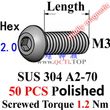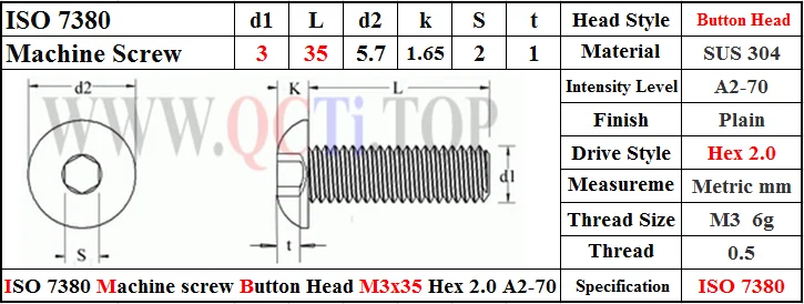 We have ISO 7380 screws M3x2.5 M3x4 M3x5 M3x6 M3x8 M3x10 M3x12 M3x14 M3x16 M3x18 M3x20 M3x22 M3x25 M3x30 M3x35 M3x40 M3x45 M3x50 in stock Button head Hex 2.0 driver,SUS 304,A2-70,Mildly magnetic,Polished,ROHS.Screwed Torque 1.2 Nm.