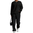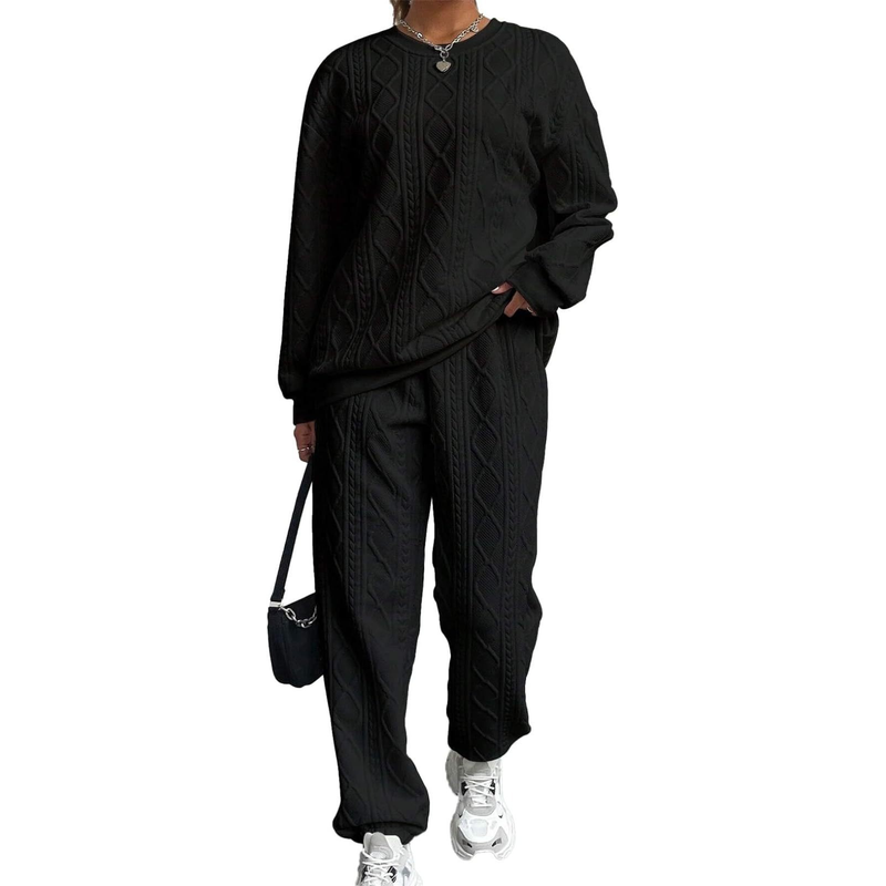 Jacquard Long Sleeve Casual Round Neck Sweater Trousers Suit Black S