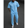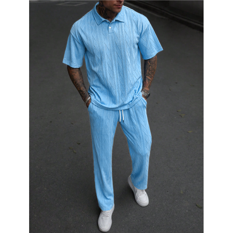 Jacquard Texture Polo Shirt Men's Short-sleeved Trousers Casual Two-piece Suit Blue XXL