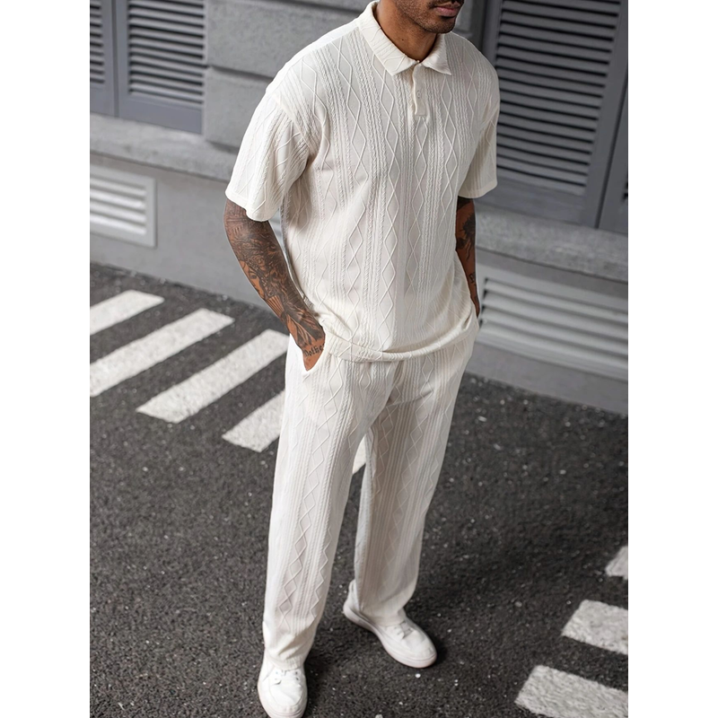 Jacquard Texture Polo Shirt Men's Short-sleeved Trousers Casual Two-piece Suit White S
