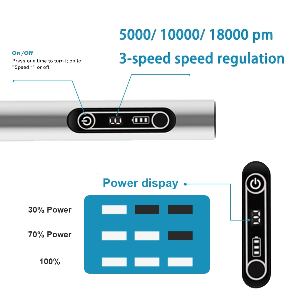3 Rotation Speed controled by one button - 5000\\\/10000\\\/15000 rpm, shows clearly with three red light on the tool body. It can meet different tasks against your needs.