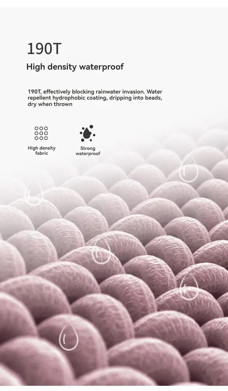 190T, strong blocking rainwater intrusion waterproof hydrophobic coating, drip water into beads, a shake dry.