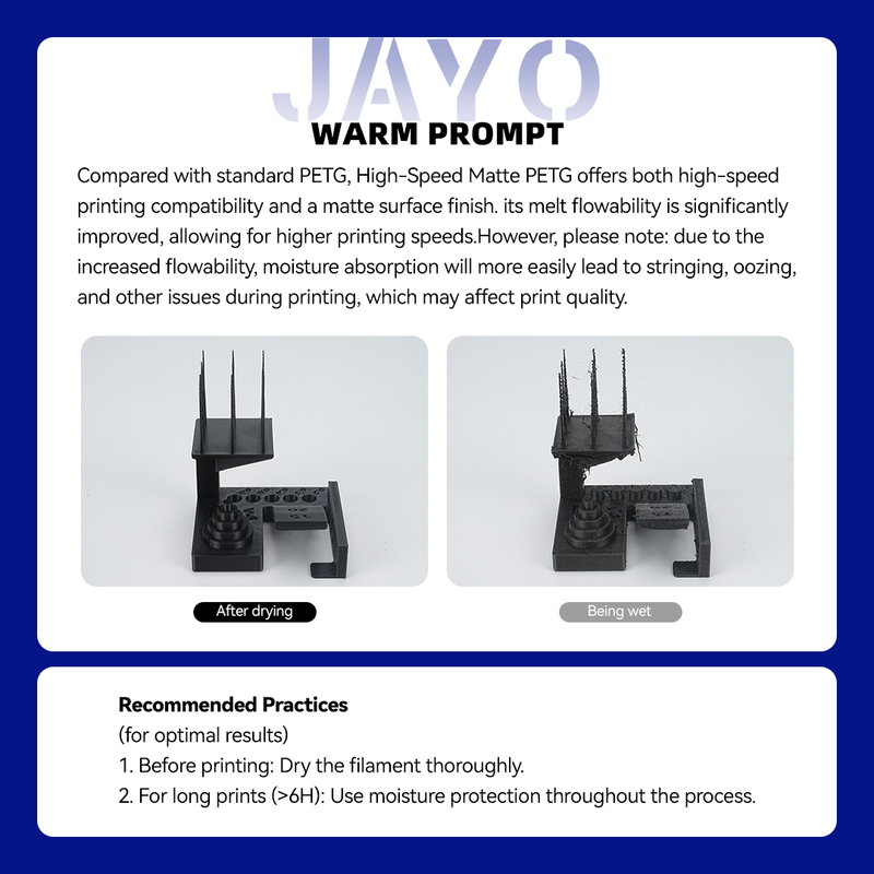 (1)【30mm/s - 600mm/s Print Speed】- With enhanced fluidity, JAYO High Speed Matte PLA filament melts rapidly and flows smoothly, allowing for up to 600mm/s fast printing speed. You can complete the projects quickly without compromising on quality, bring your ideas to life with high-speed printing.