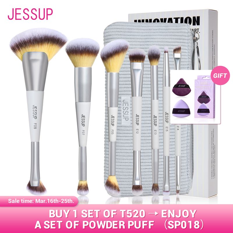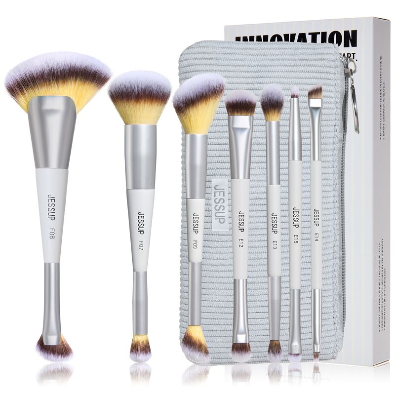 Jessup Makeup Brush Set 7pcs Dual Ended Makeup Brushes Premium Synthetic Foundation Contour Blush Highlight Blending Eyebrow Eyeshadow Shader Concealer Brush with Bag, Quiet Gray T520