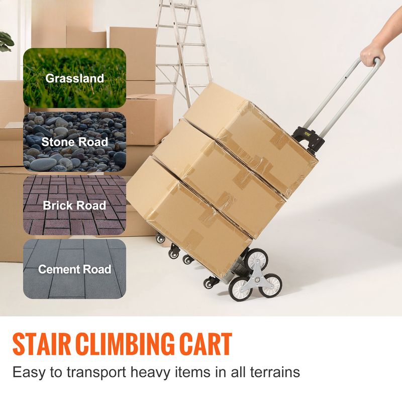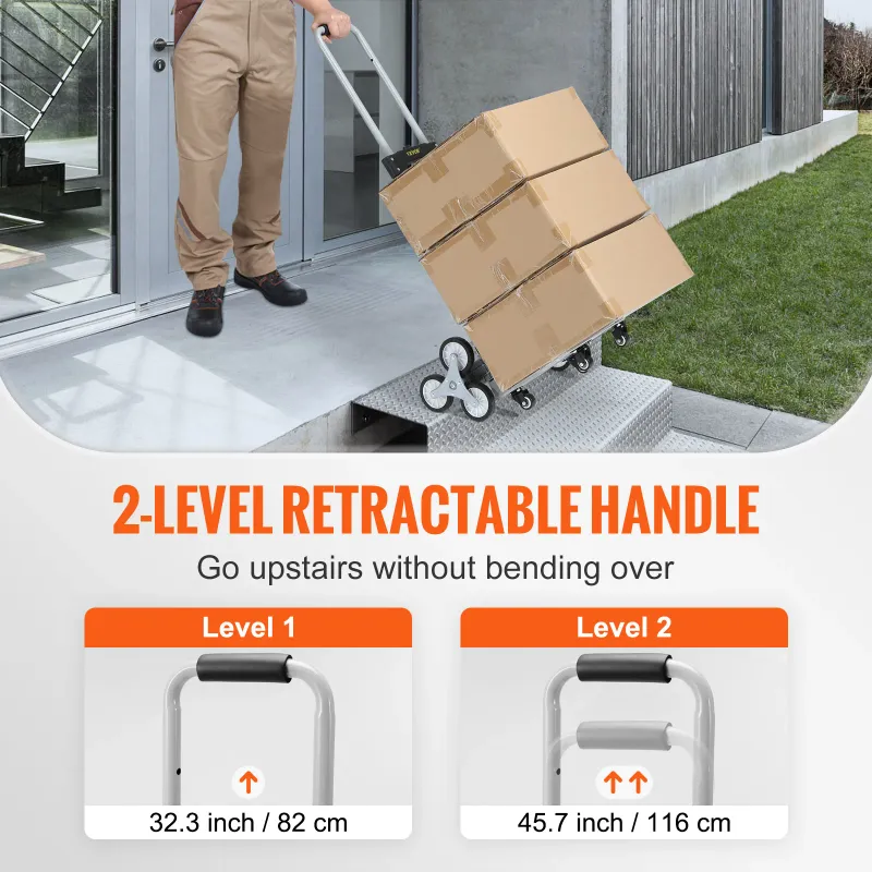 Strong Loading: Our stair climber adopts an integrated steel frame, providing firmness and durability for long-term use. Thanks to this high-quality structure, it can carry 220 lbs on the ground and 110 lbs when climbing, meeting most household and commercial needs. Note: when the loaded items are more than 110 lbs, they need to be placed diagonally and you should hold the handle in front.