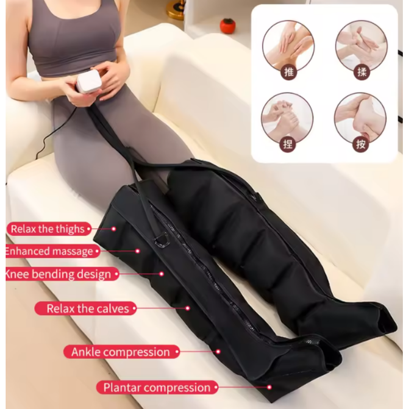 2.360° Full Leg Massage• Dual Pressure System: • Vertical Pressure: Lifts and massages your legs to promote blood circulation. • Horizontal Pressure: Relieves muscle stiffness and swelling. • 3D Foot and Knee Massage: Targets key areas with intelligent air pressure to deeply soothe your calves, feet and knees.