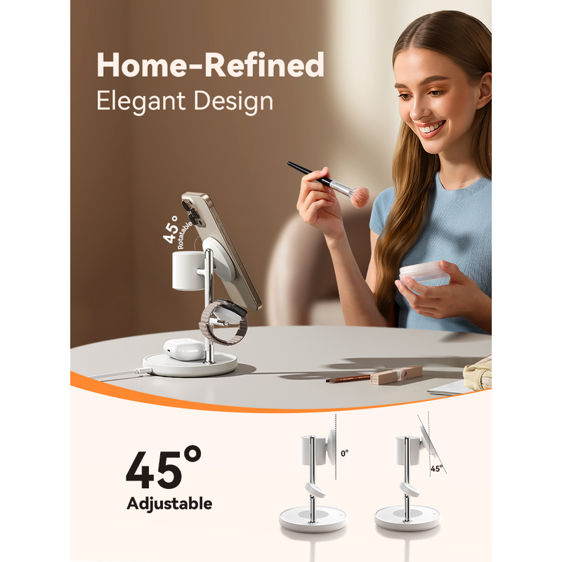 3.Multi-Functional Phone Stand: Effortlessly power your iPhone (with Qi2/MagSafe), AirPods, and Apple Watch.JOYROOM charging station powerful magnets ensure perfect alignment—just place your device and it snaps securely into place. Lift off easily when charged, supported by a sturdy, non-slip base that stays firmly planted. Adjust the MagSafe charger up to 45° for perfect viewing or use it as a phone stand,, seamlessly switch between landscape and portrait modes for optimal viewing comfort while maintaining a reliable charge. It’s the sleek solution for powered devices and a clutter-free desk