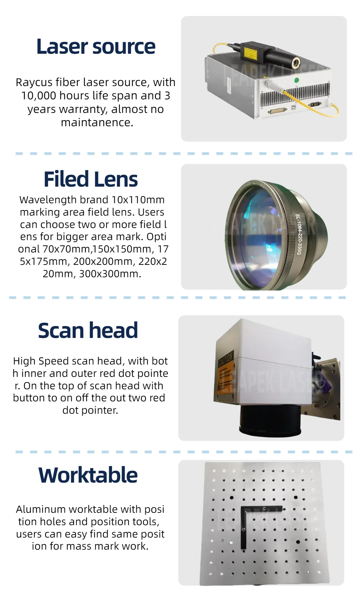 3. Convenient and fast to use, the fiber laser marking machine is very small in size and adopts built-in air cooling mode. It does not need to be equipped with a water cooler for cooling like a semiconductor laser marking machine. Now Leapek Laser Co., Ltd. has developed a number of portable fiber laser marking machines for easy transportation and installation.