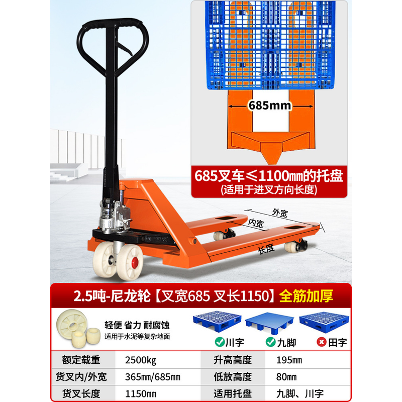 JX Ground Bull Forklift Manual Hydraulic Hand Truck 1 Ton 2T Hand Push Lifting Pallet Truck Household