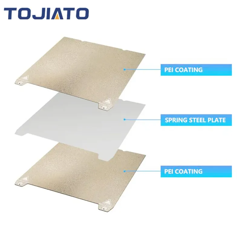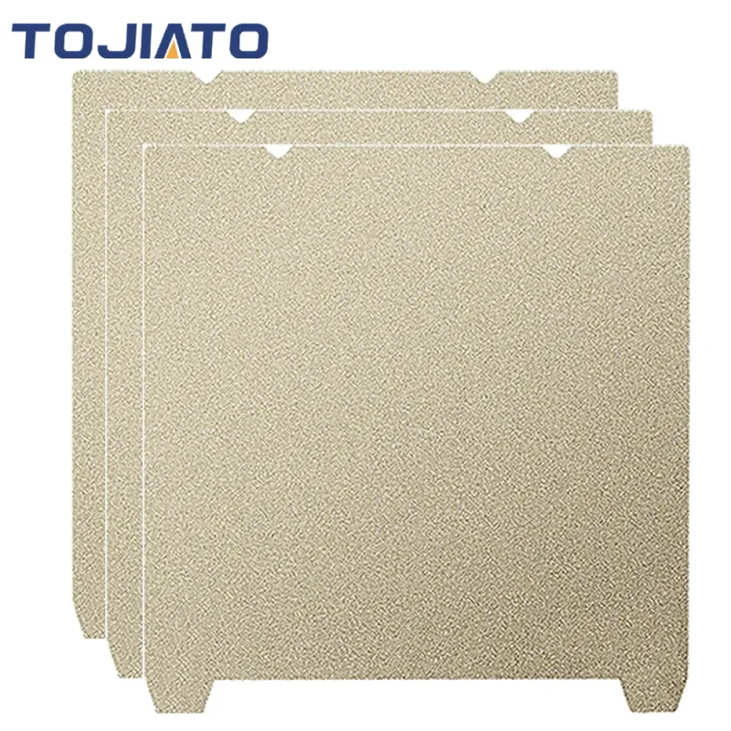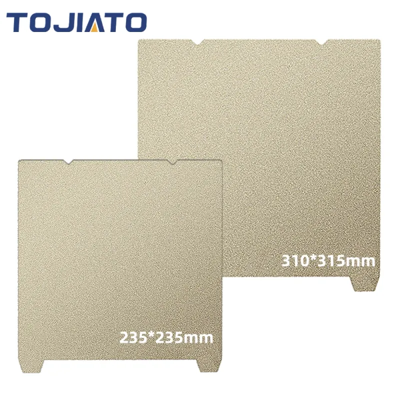 Two in One Kit: PEI Printing Plate consists of two parts, soft magnetic adhesive plate and gold frosted PEI spring steel plate. The soft magnetic plate has a strong magnetic force to ensure that the PEI spring steel plate will not move during the printing process. At the same time, the PEI spring steel plate has excellent bending resistance, and the model can be removed by bending after the printing is completed.
