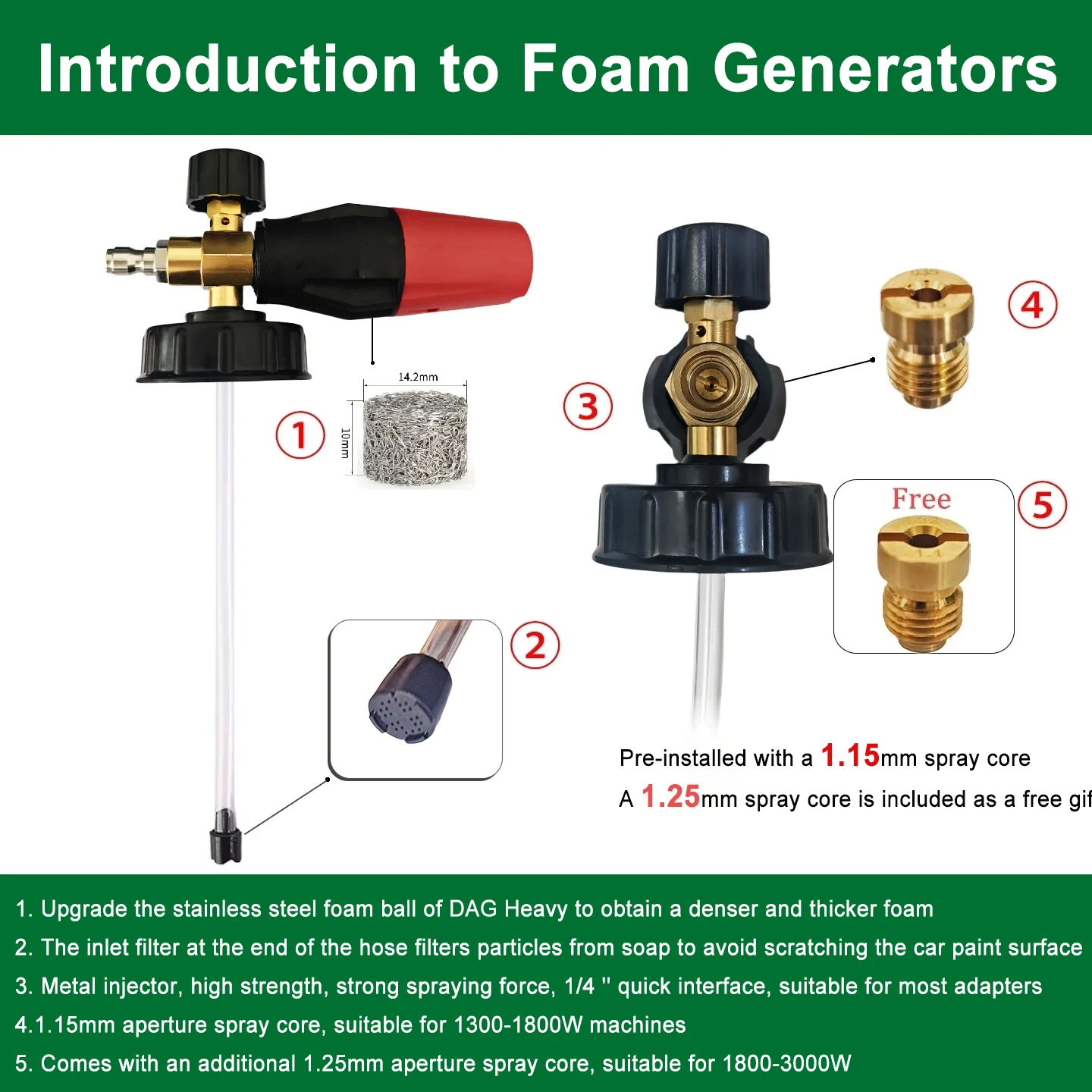 Powerful foam monitor, which can spray soap foam up to 6m/20ft; Large and evenly routed filters have been upgraded to obtain denser and thicker foam. The high-pressure cleaning foam gun made of aluminum manifold and nylon cover, equipped with 32 ounce bottles, has unique design, fine workmanship, precision processing, heavy duty, corrosion resistance, and durability. It can produce heavy snow foam to clean your cars and vehicles. The foam nozzle can realize vertical and horizontal spray modes, and the spray angle varies from 0 ° for pencil to 60 ° for sector. The 32 ounce bottle has ergonomic grip and a large opening for easy filling. The foam monitor with a standard 1.15mm nozzle is usually used for 800~1850psi pressure washer. It is equipped with an additional 1.25 mm brass nozzle to generate a large amount of foam on the 1850~4000 psi electric pressure washer. If you have a commercial high-pressure cleaner, to produce thick foam and use it normally, use a flat screwdriver to remove the 1.15mm nozzle from the foam monitor, and then assemble the 1.25mm nozzle to your foam monitor. Use less soap, more environmentally friendly and efficient! In order to produce dense foam, just use a 1:5 mixture ratio of car shampoo and water in the bottle. The bottle with measurement marks is semi transparent, and you can see the rest of the shampoo. The end of the oil suction hose with a heavy-duty plastic filter is equipped with a filter to filter out particles in soap or water. Do not scratch the car paint surface.