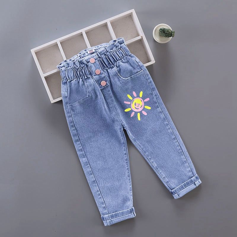 Kids Girl Jeans Floral Cartoon Long Pants Spring Autumn Graffiti Painting Print Casual Trousers with Hole Children Denim Pants