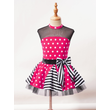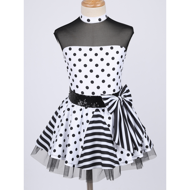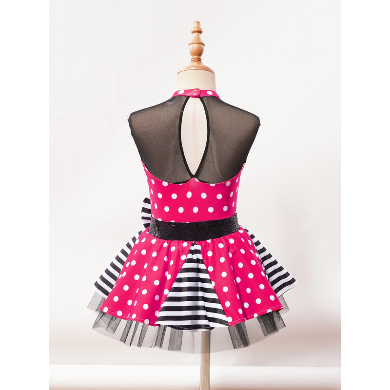 Shiny sequins at waist, hollow back, tutu mesh style, a layer polka dots with striped patchwork cloth in outside, a layer mesh in middle.