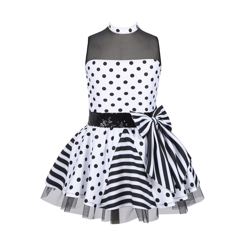 Shiny sequins at waist, hollow back, tutu mesh style, a layer polka dots with striped patchwork cloth in outside, a layer mesh in middle.