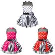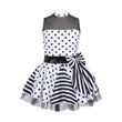The dress with sleeveless and round collar, Polka dots print and patchwork style mesh design, bowknot decorated at waist.