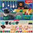 1. Complete Toy Kit -This pretend cooking sets include pots and pans, plates and dishes, kettle, spoon, shovel, fork, cutting board, fake food like fruits and vegetables/egg/fast foods etc. Great cute addition for any play kitchen.