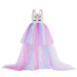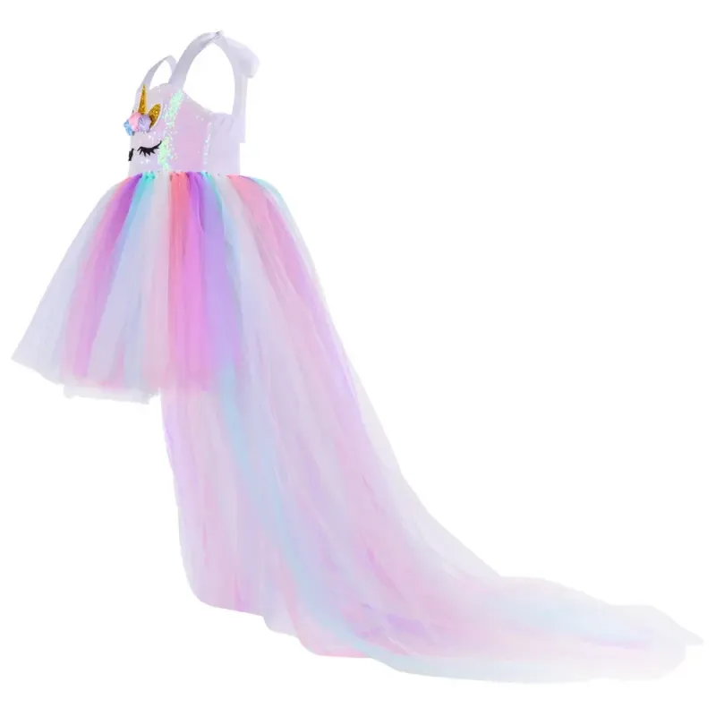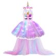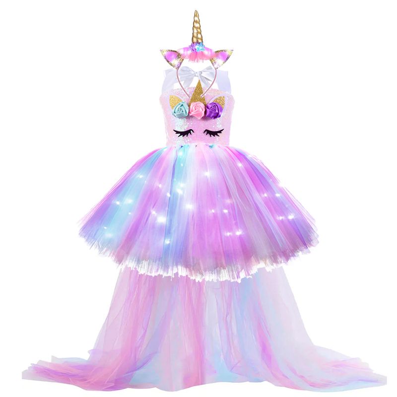 Kids Long Tail Unicorn Dress with LED Lights Girls Birthday Party Dress Princess Carnival Costume Hairband Pastel Rainbow Gown