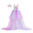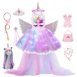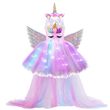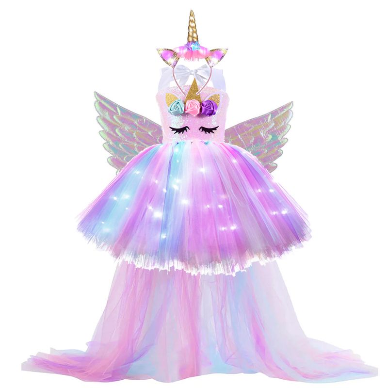 Kids Long Tail Unicorn Dress with LED Lights Girls Birthday Party Dress Princess Carnival Costume Hairband Pastel Rainbow Gown