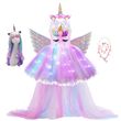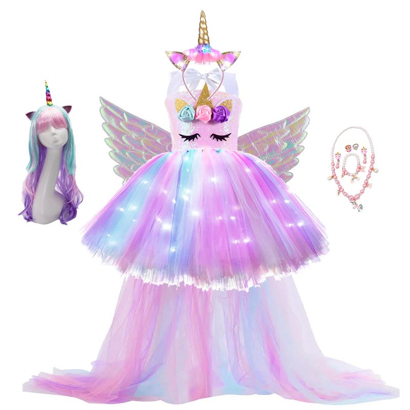 Kids Long Tail Unicorn Dress with LED Lights Girls Birthday Party Dress Princess Carnival Costume Hairband Pastel Rainbow Gown