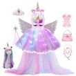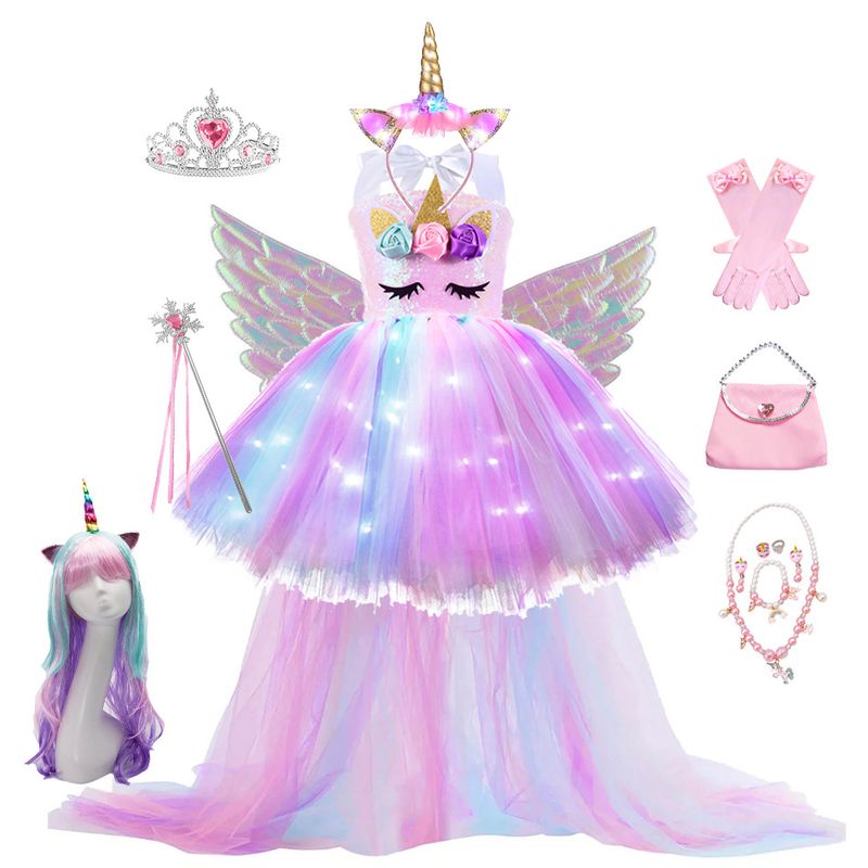 Kids Long Tail Unicorn Dress with LED Lights Girls Birthday Party Dress Princess Carnival Costume Hairband Pastel Rainbow Gown