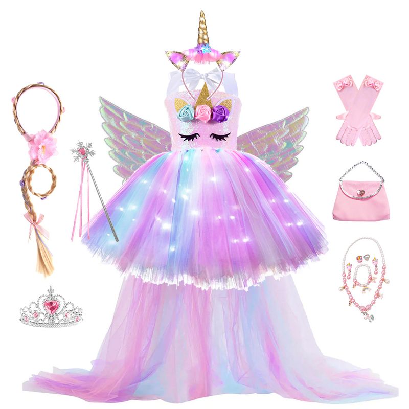 Kids Long Tail Unicorn Dress with LED Lights Girls Birthday Party Dress Princess Carnival Costume Hairband Pastel Rainbow Gown