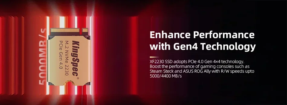 XF 2230 SSD adopts PCIe 4.0 Gen 4×4 technology. Boost the performance of gaming consoles such as Steam Steck and ASUS ROG Ally with R/W speeds up to 5000/4400 MB/s.