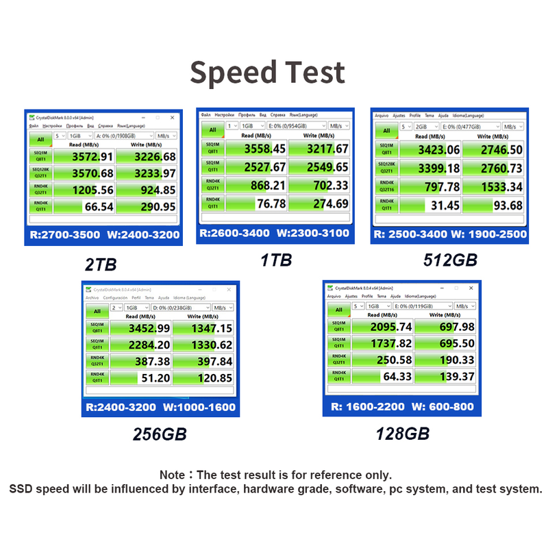 The speed test is just for your reference, which will be influenced by many factors, such as interface type, computer hardware grade, computer system, and test system.