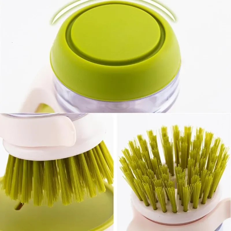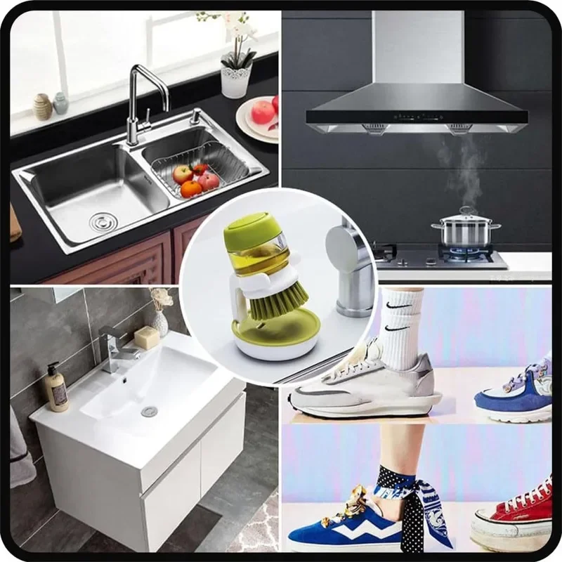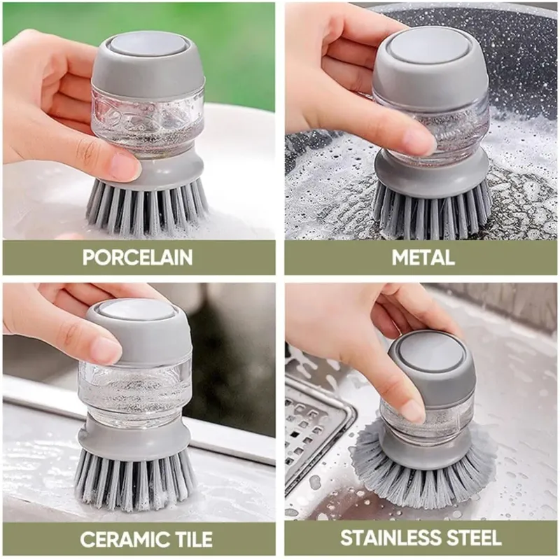 【Multifunctional Pressing Cleaning Brush】Crafted with high-temperature resistant nylon brush filament, this scrub brush is gentle yet effective, ensuring it won't harm non-stick pan coatings. The entire Dish Brush with Soap Dispenser is washable, making cleaning a breeze.