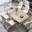The dining table adopts a rectangular design, and the tabletop is made of high-quality marble, presenting a light gray tone, giving people a calm and atmospheric feeling. The table legs are made of golden metal material, which is not only sturdy and durable, but also adds a sense of luxury. The desktop design is simple and elegant, with delicate edge treatment, making people feel comfortable during use.