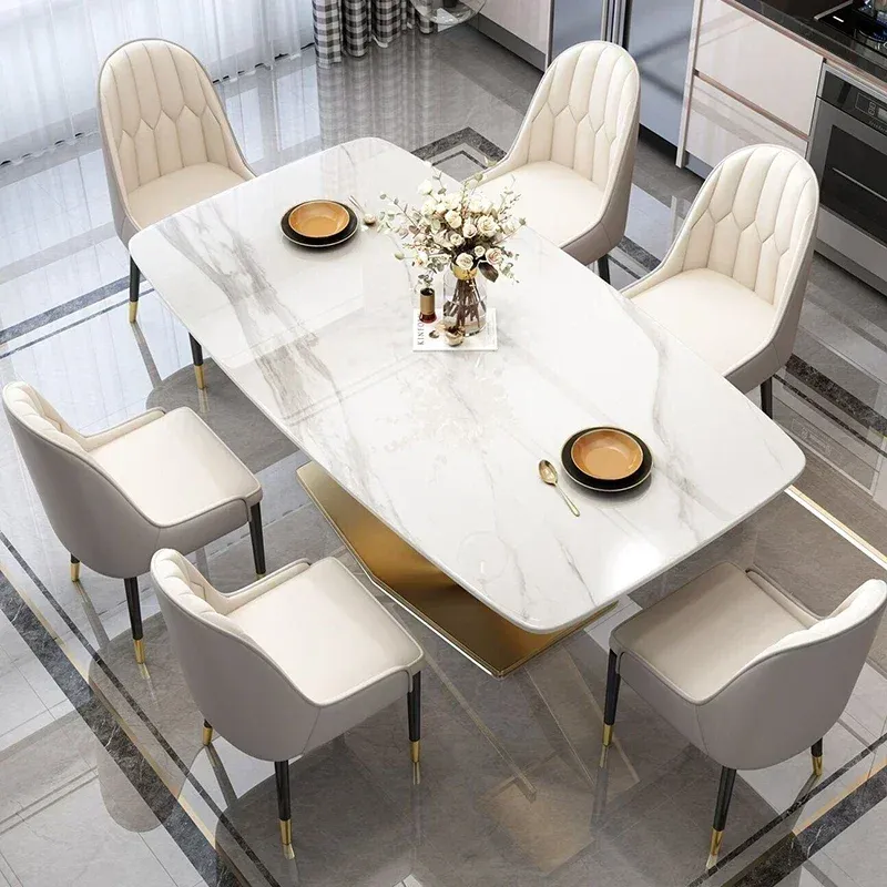 The dining table adopts a rectangular design, and the tabletop is made of high-quality marble, presenting a light gray tone, giving people a calm and atmospheric feeling. The table legs are made of golden metal material, which is not only sturdy and durable, but also adds a sense of luxury. The desktop design is simple and elegant, with delicate edge treatment, making people feel comfortable during use.