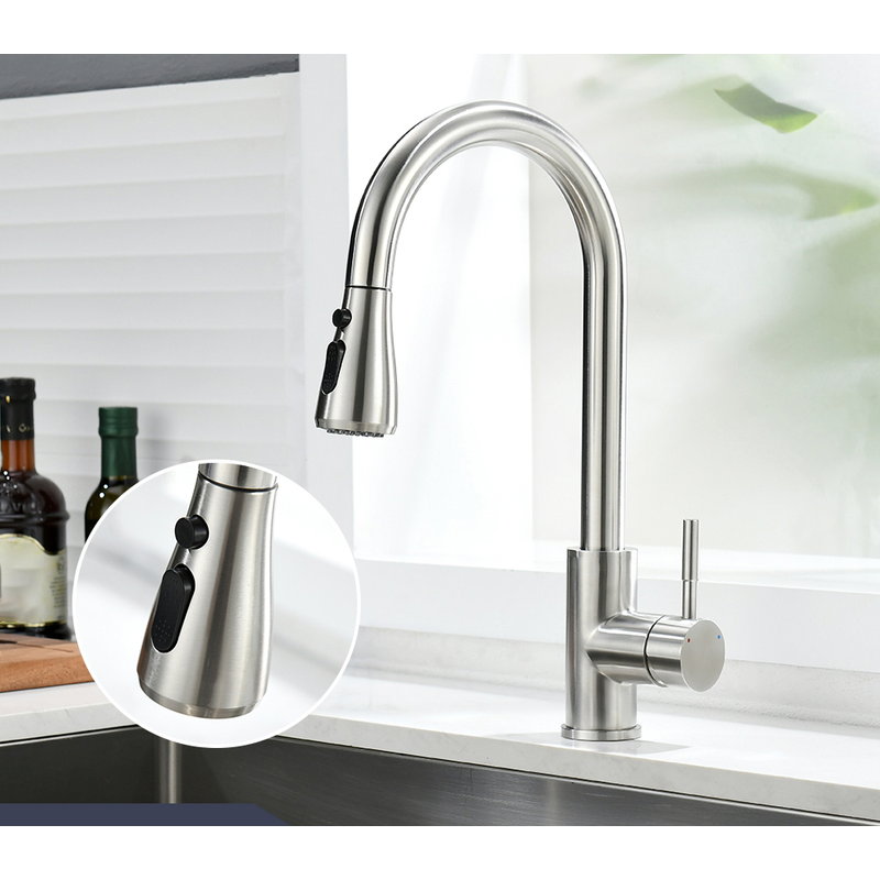 This is a lightweight and uniquely designed kitchen sink pull-up hot and cold faucet. The bent pipe outlet pipe is wrapped in high-quality 304 stainless steel, and the inner pipe and outlet nozzle are made of high-quality ABS plastic. The cold and hot switch uses a ceramic valve core, which is durable!