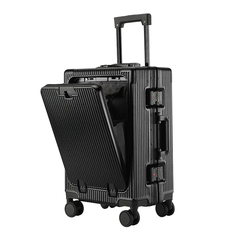 KLQDZMS Laptop Suitcase USB Charging Boarding Case PC Front Opening Aluminum Frame Trolley Case 20"24 Inch Carry-on Luggage