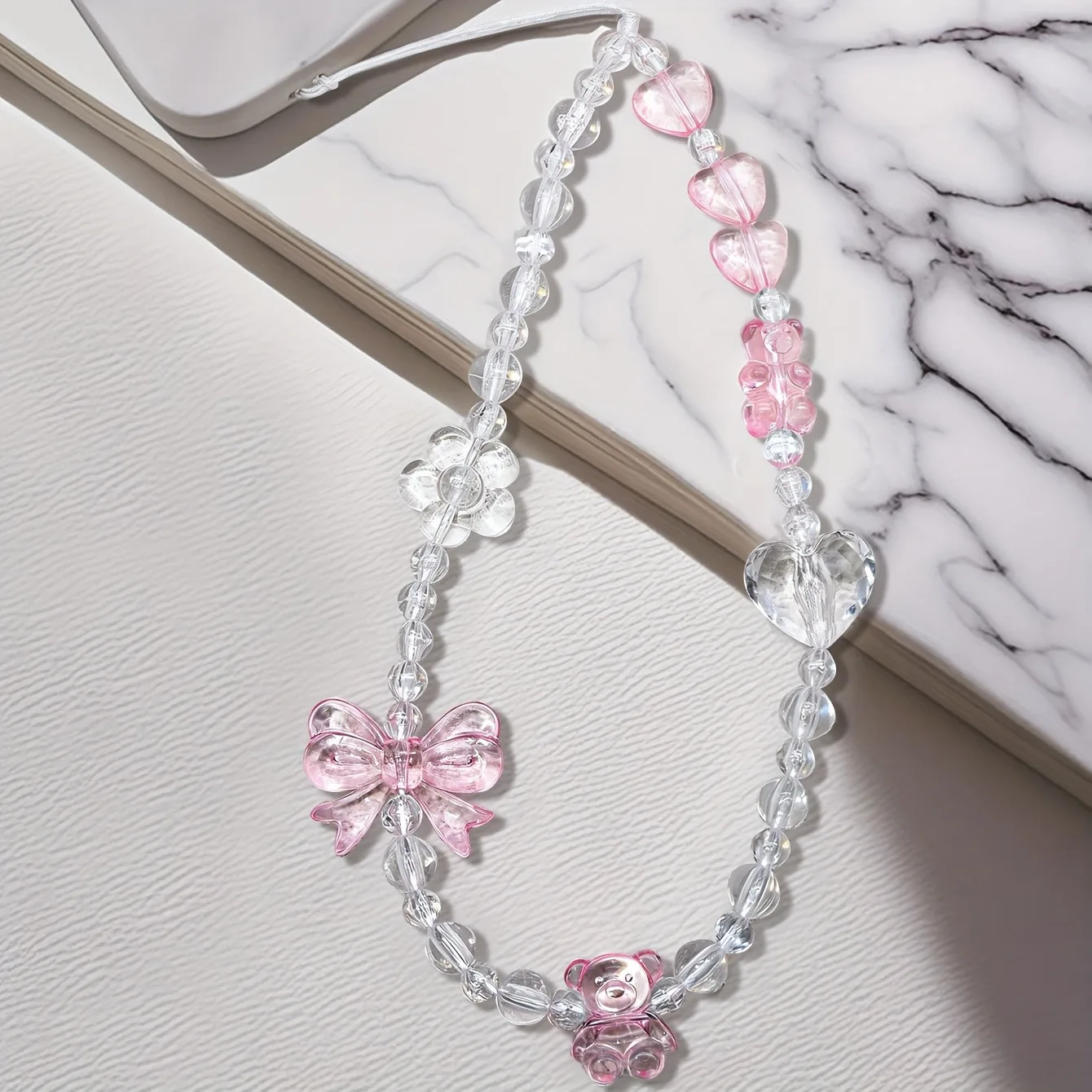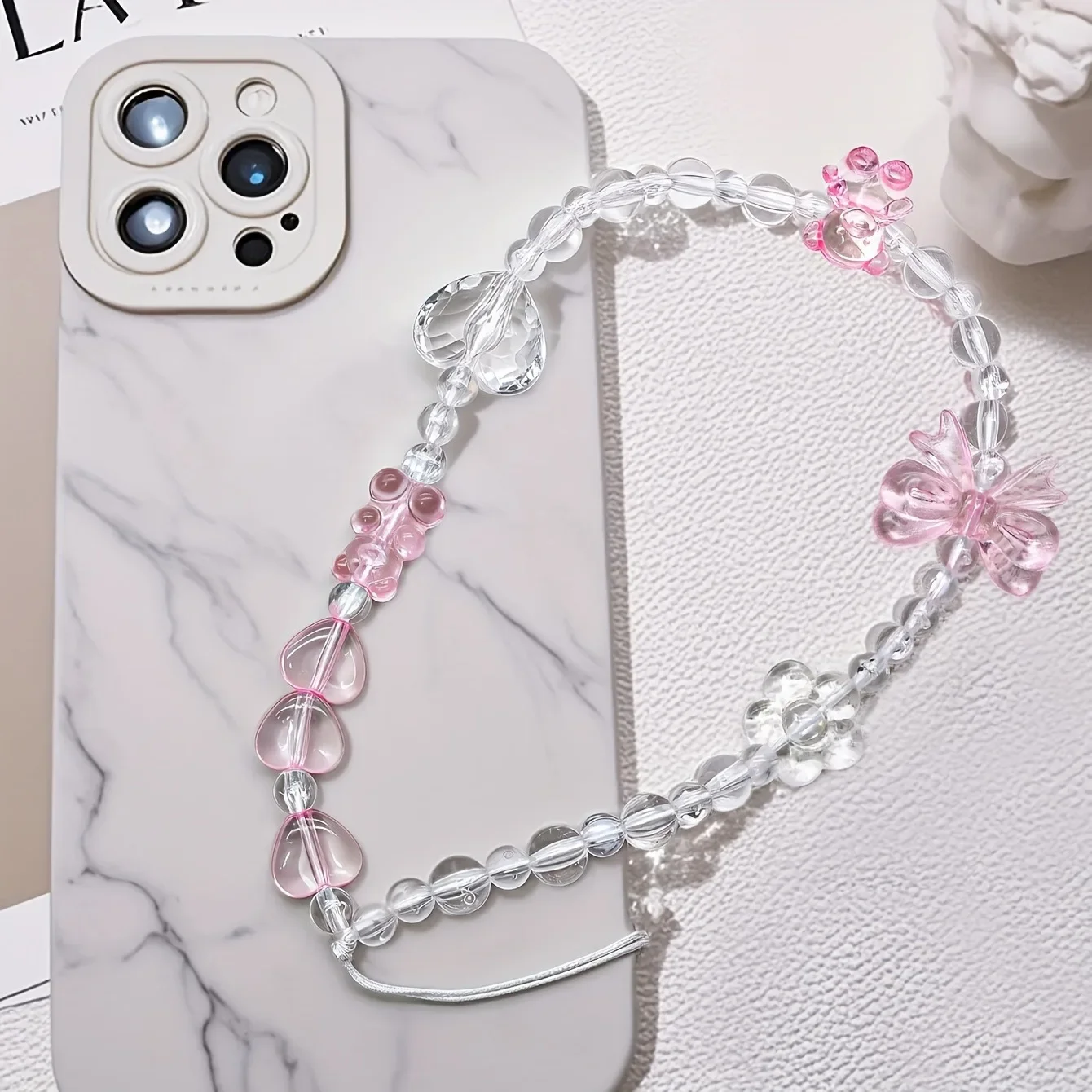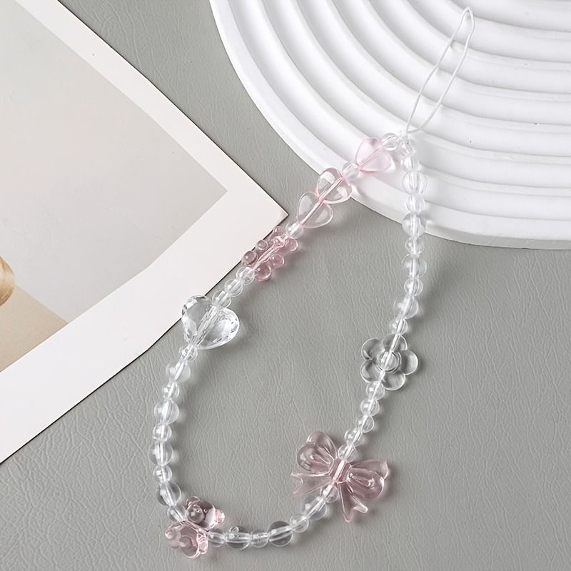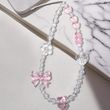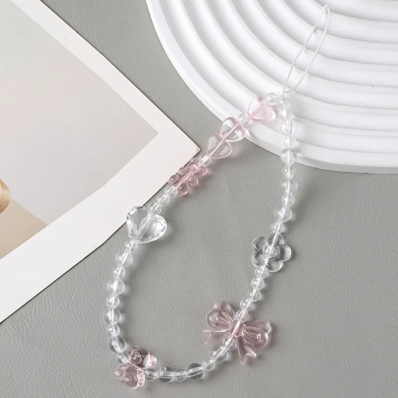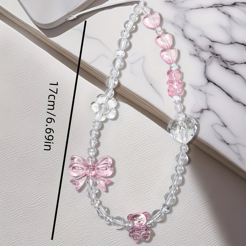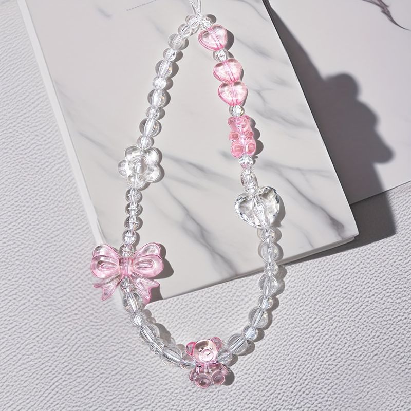 Korean Cute Pink Bowknot Bear Heart Beaded Phone Chain Charm Lanyard Keychain Woman Girl Bag Camera Pendant For Case