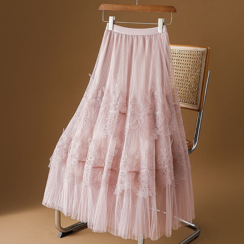 Korean Sweet Summer Solid Color Women's Clothing Elastic Waist Gauze Lacefashion Versatile High Waist Mid Length A-line Skirts